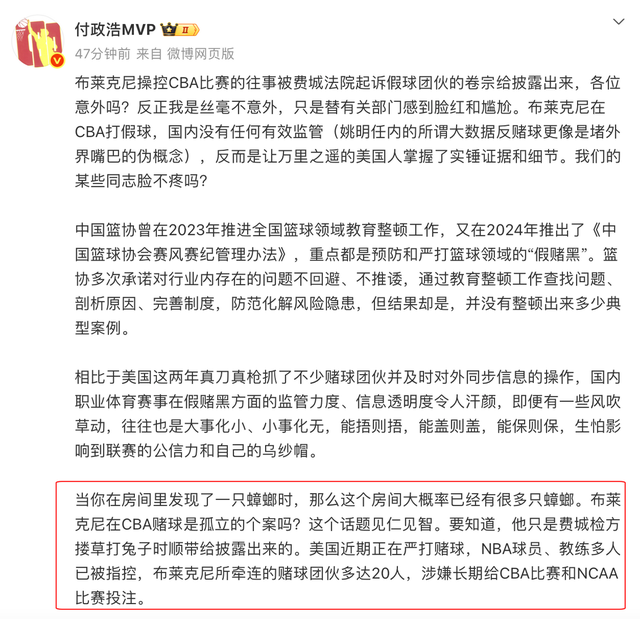 此次事件是美国媒体报道,美国这两年真刀真枪抓了不少赌球团伙并及时对外同步信息,此次抓到布莱克尼团队属于顺带披露,还不是专门侦察,作为对比,国内CBA公司并没有率先发现赌球、打假球的情况。