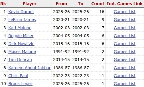 据统计,这是杜兰特在生涯18个赛季第17次砍下30+,历史最多。詹姆斯9次第二,卡尔·马龙7次第三。